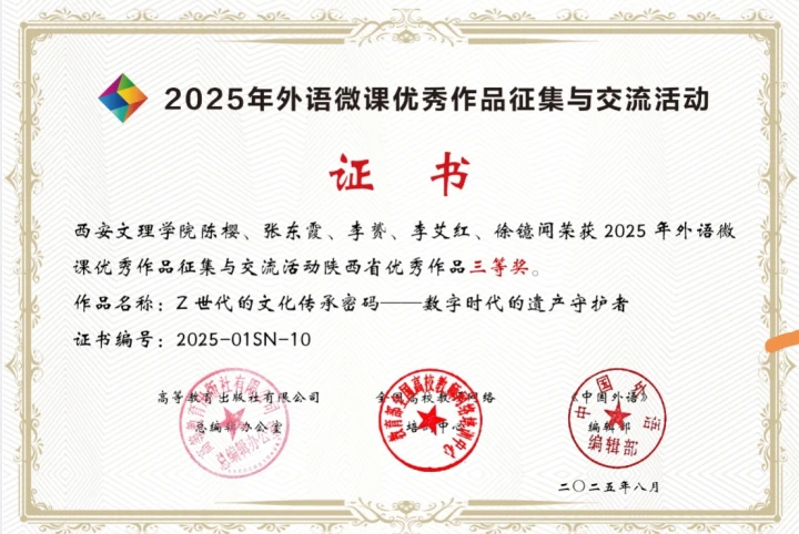 近日,由高等教育出版社、全国高校教师网络培训中心与《中国外语》编辑部联合主办的2025 年外语微课优秀作品征集与交流活动省级评审结果公布,英国365集团官网陈樱、张东霞、李赟、李艾红、徐镱闻组成的教师团队表现亮眼,其作品《Z 世代的文化传承密码— 数字时代的遗产守护者》荣获陕西省优秀作品三等奖。