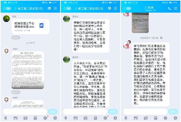 教工三支部召开“主动作为,共抗疫情”线上主题党日活动,要求党员同志要做思想与行动上的先锋者,党员教师要起到模范带头作用。大家纷纷表示要把思想和行动统一到习近平总书记关于疫情防控工作重要讲话和重要指示精神上来,立足岗位实际,发挥党员先锋模范作用。