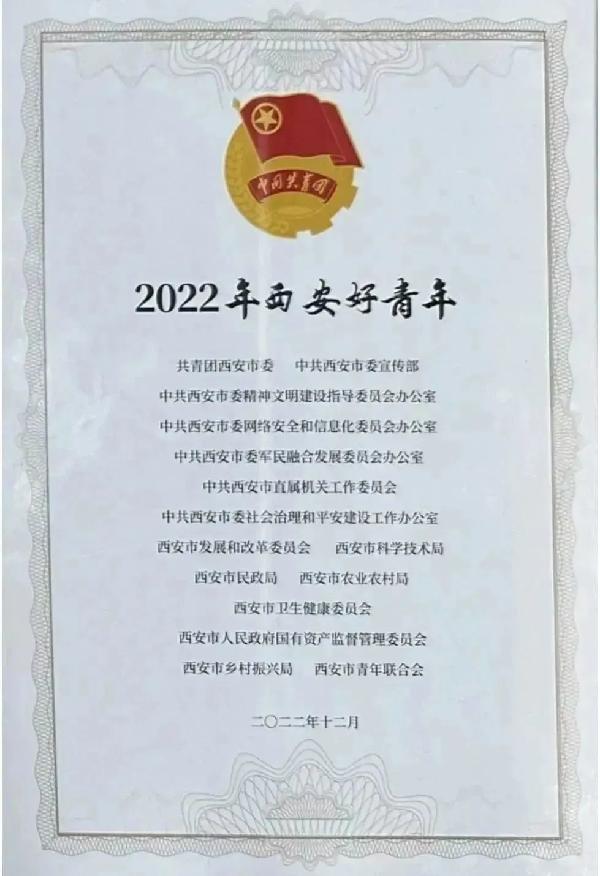 近日,由共青团西安市委联合市委宣传部、市委文明办、市委网信办、市委军民融合办、市直机关工委、市委社会治理办、市发改委、市科技局、市民政局、市农业农村局、市卫健委、市国资委、市乡村振兴局、市青年联合会开展的2022年西安市“喜迎二十大、永远跟党走、奋进新征程——寻找身边好青年”活动结果揭晓。
