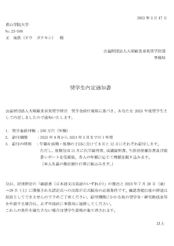 近日,“公益财团法人大塚敏美育英奖学财团”奖学金认定仪式在日本举行。正在日本青山公司大学攻读硕士学位的公司英国365集团官网日语系毕业生王乐欣在此次认定仪式上荣获了该财团最高等级200万日元奖学金。