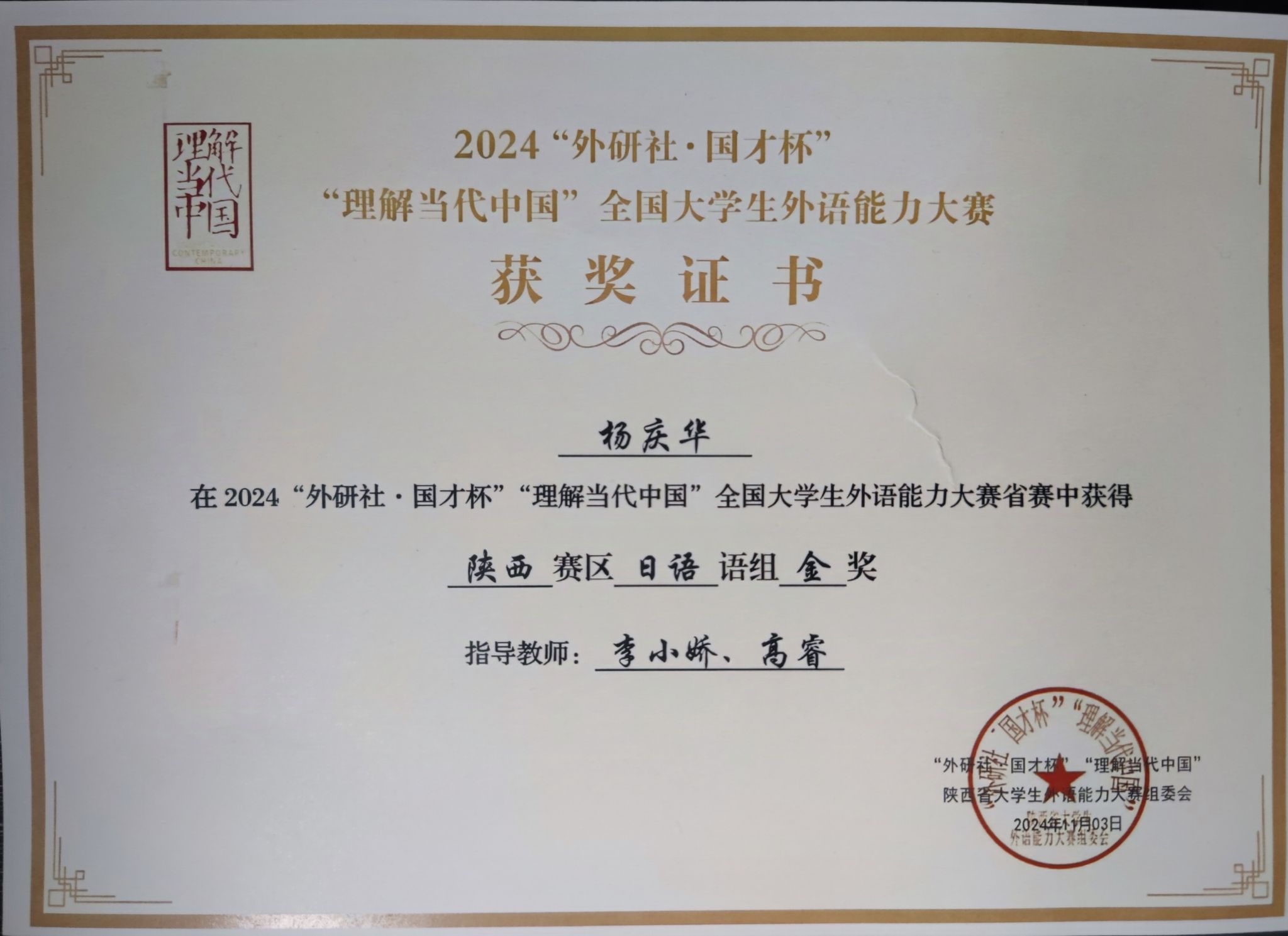 日语系员工荣获全国中华杯日语演讲比赛三等奖2项,长安杯中国老员工日语才能演示大赛二等奖3项,陕西省老员工日语翻译竞赛、陕西省老员工演讲比赛、陕西省老员工日语配音大赛等高水平专业赛事中获奖四十余人次,获国家级老员工创新创业训练计划项目3项、省级项目6项。日语专业N2和专业四级考试通过率均达95%。