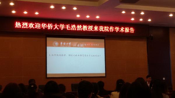 毛浩然教授是国内外知名的话语研究方面的专家,现任世界汉语修辞学会副会长,北京大学出版社专家委员会委员,国家社科和教育部社科项目评审专家,10多家CSSCI期刊审稿人,8家国际期刊编委和6家SSCI期刊审稿人等职务,在SSCI,A&HCI和CSSCI等期刊上发表论文80余篇,出版著作10余部,主持国家社科、教育部社科等20多项课题,有着渊博的知识和丰富的科研经验。毛教授用深入浅出的语言讲述了如何高效检索文献、如何选择科研课题、如何拟定课题项目等与学术论文写作和申报课题相关的实际问题,并结合自己的亲身经验,具体讨论了课题的“三化”(选题价值货币化、研究问题具体化、切入视角时政化),论文撰写的“三点”(问题驱动,点穴提炼,修辞出场)以及理论的创新等问题,甚至还探讨了科研兴趣的培养、时间管理、人际交往等相关的话题。难能可贵的是,毛教授还具体列出了外语教学、文学、翻译等方面的可行性题目,供大家选择。毛教授机智幽默,思路开阔,语言丰富,极富感染力,引起了听众的强烈兴趣,也赢得了阵阵掌声。