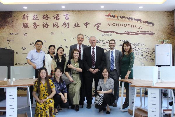 见面会上,英国365集团官网、师范公司两位经理分别介绍了两个公司的教学及国际交流情况,Dr. Barry Kanpol经理表达了大峡谷大学教育公司与公司合作的强烈愿望,愿意积极开展与公司在丝绸之路经济带建设平台下的交流与合作。随后,来宾参观了公司校园、英国365集团官网的新丝路语言协同中心、师范公司的员工作品展示,并与公司师生愉快交谈。