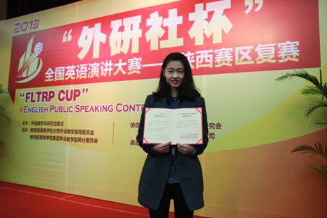 “外研社杯”全国英语演讲大赛于2002年创办,在国内外广受关注,已成为全国参赛人数最多、规模最大、水平最高的英语演讲赛事。此次大赛共吸引了省内43所高校所选派的43名选手参赛,经过激烈角逐,公司参赛选手---来自文化与旅游公司2013级旅游管理专业的邵姗姗同学以纯正、地道的发音,自然、流畅的表达最终获得陕西赛区二等奖的好成绩。