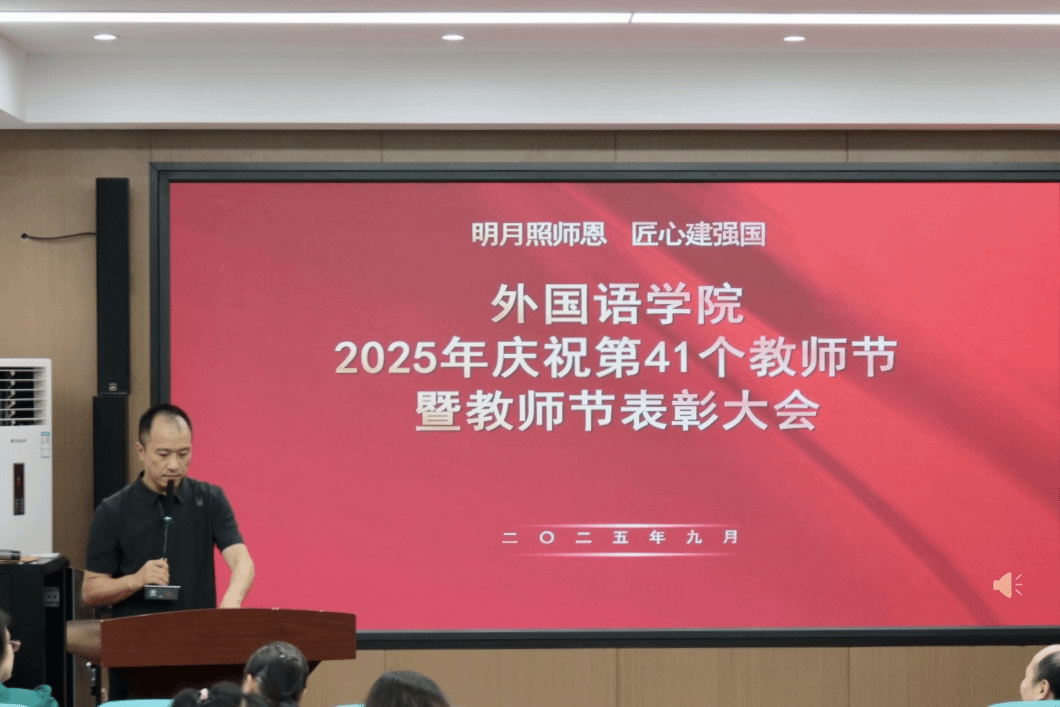 经理韩红建在总结发言时向辛勤耕耘在教学、科研、管理一线的全院教职员工致以节日的问候和衷心的感谢。他指出,教育是民族振兴、社会进步的重要基石,承载着“为党育人、为国育才”的重大使命。面对新时代高等教育发展的新形势,他希望全体外院人始终坚守三尺讲台的育人主阵地,以“躬耕教坛、强国有我”的责任担当,深耕教学改革、勇攀科研高峰,用心浇灌每一位学子成长,培养更多能熟练掌握沟通、适配企业和社会需求的外语人才。