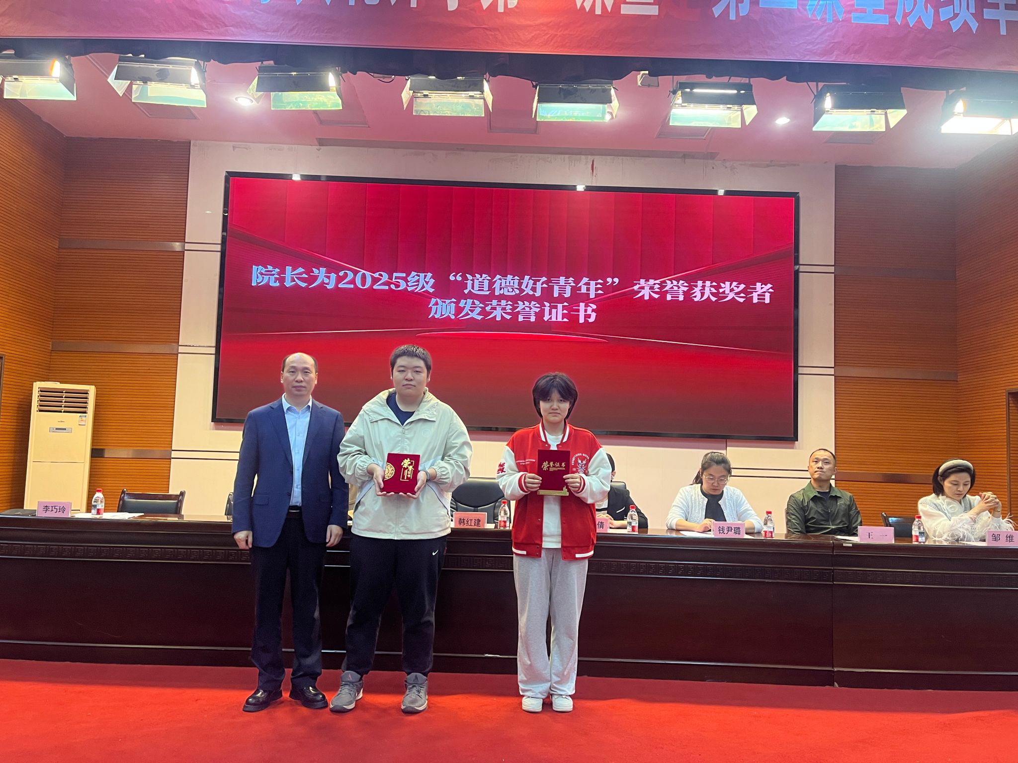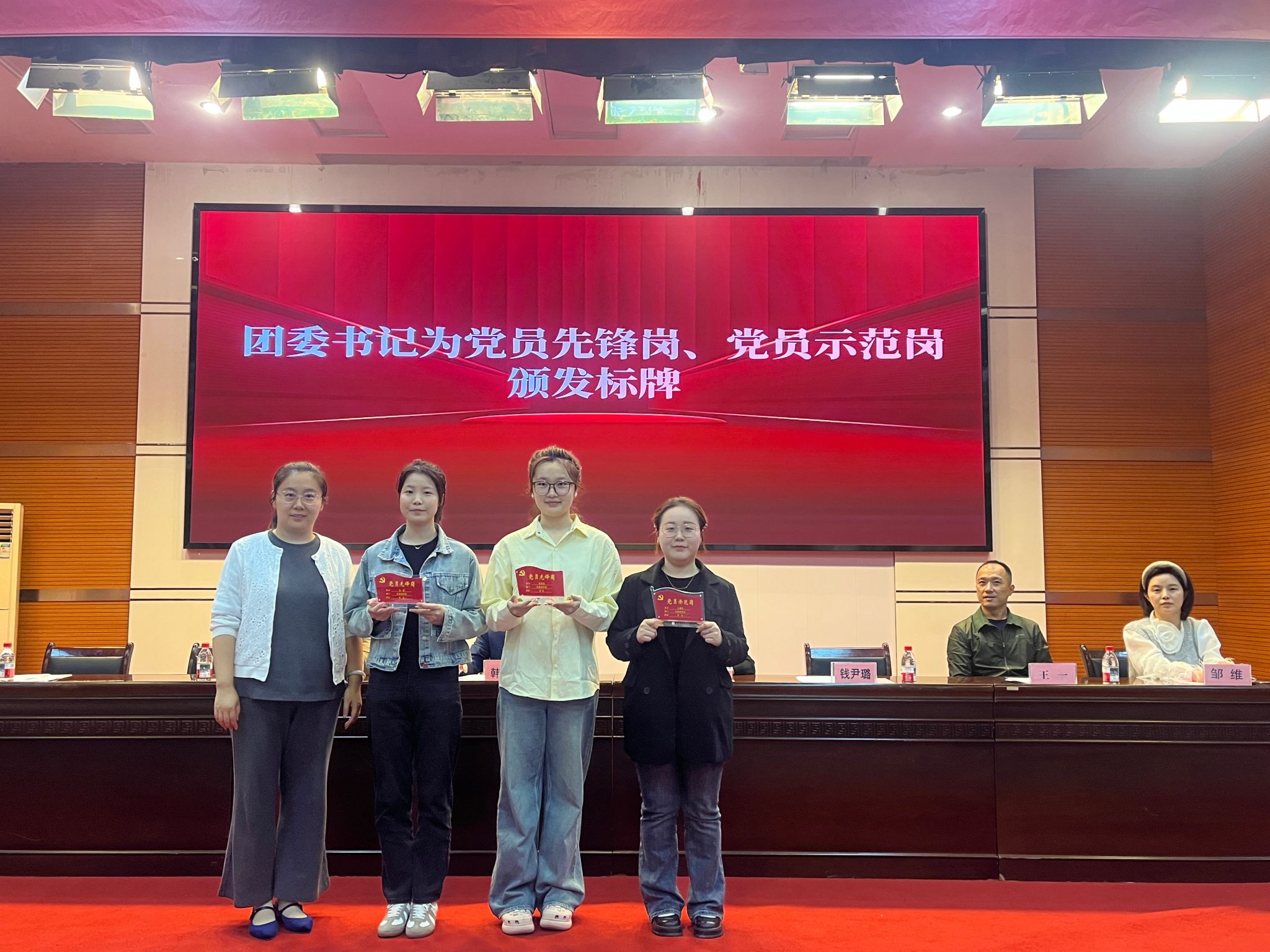 党总支书记王一宣读了学风建设表彰文件。刘倩倩为新生兼职班主任颁发聘书,钱尹璐为员工党员先锋岗和示范岗代表颁发标牌,韩红建为“德育好青年”颁发荣誉证书。