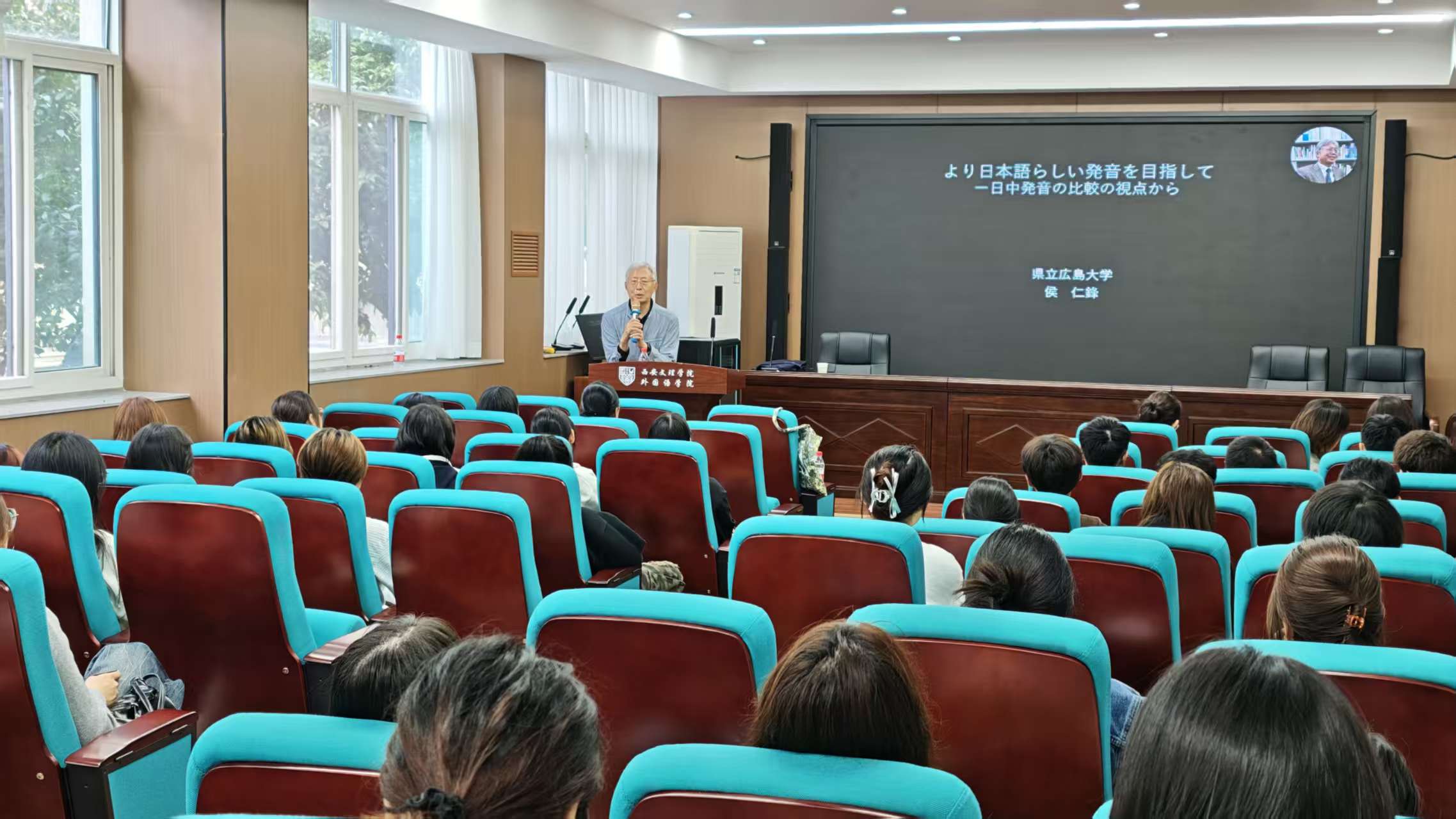 10月15日下午,英国365集团官网特邀日本县立广岛大学名誉教授、公司“七个五”特聘专家侯仁锋,在英国365集团官网员工竞赛训练中心作“中日语音对比”专题讲座,日语系全体师生参加。