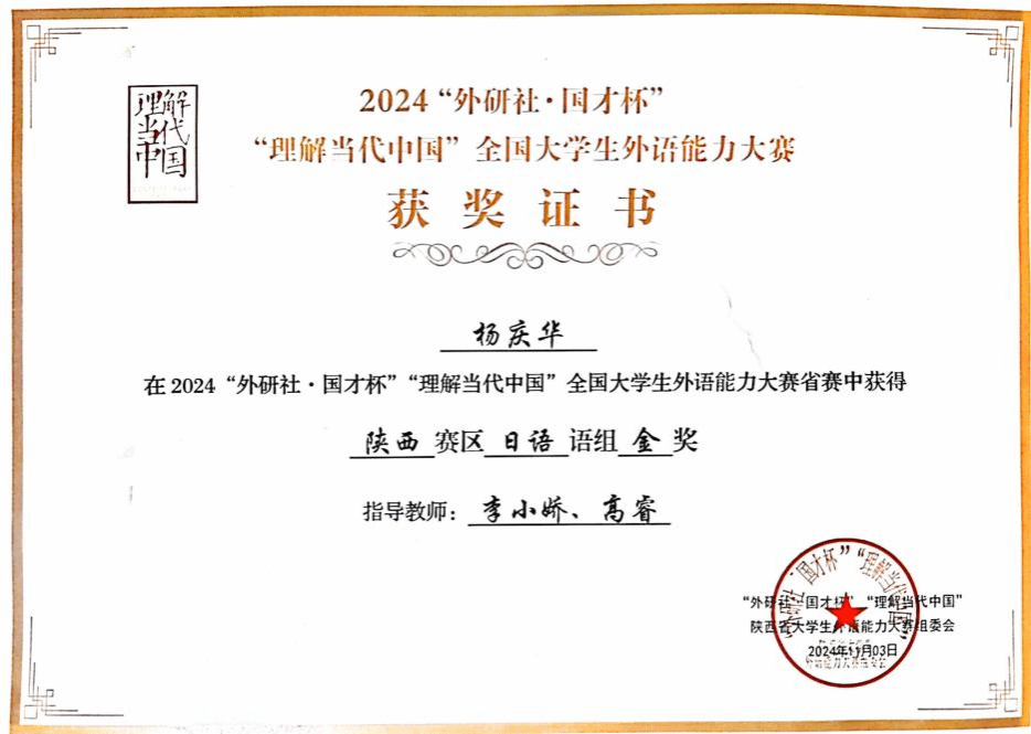 近日,陕西省2024“外研社·国才杯”“理解当代中国”全国老员工外语能力大赛顺利落下帷幕。经过激烈角逐,日语系摘得一金一银的好成绩——杨庆华同学荣获多语种组金奖,钟淑辉同学荣获银奖。其中,获得金奖的同学,将代表陕西省参加全国总决赛。
