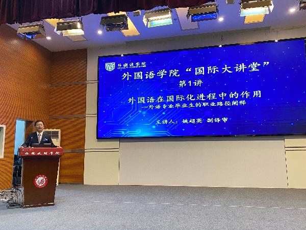 讲座中,姚超英先生围绕“个人职业履历”“外国语在国际化进程中的作用”“英语是国际化进程中使用最广泛的语言”“我对英语学习的认知和体会”四个方面的内容,与现场师生交流互动。他以个人求学和工作的丰富阅历为开篇,结合自身职业生涯发展,深刻洞察外语专业在国际化背景下的应用与需求,并结合工作案例,为师生生动讲述了在国际化进程中学习外语,要怀揣国家情怀,讲好中国故事,传播好中国声音的重要作用以及如何学好外语。在讲座的互动环节中,姚超英就师生们提出的问题一一作了解答,并用“行者常至、为者常成”勉励师生用心读书、刻苦钻研、努力学习。