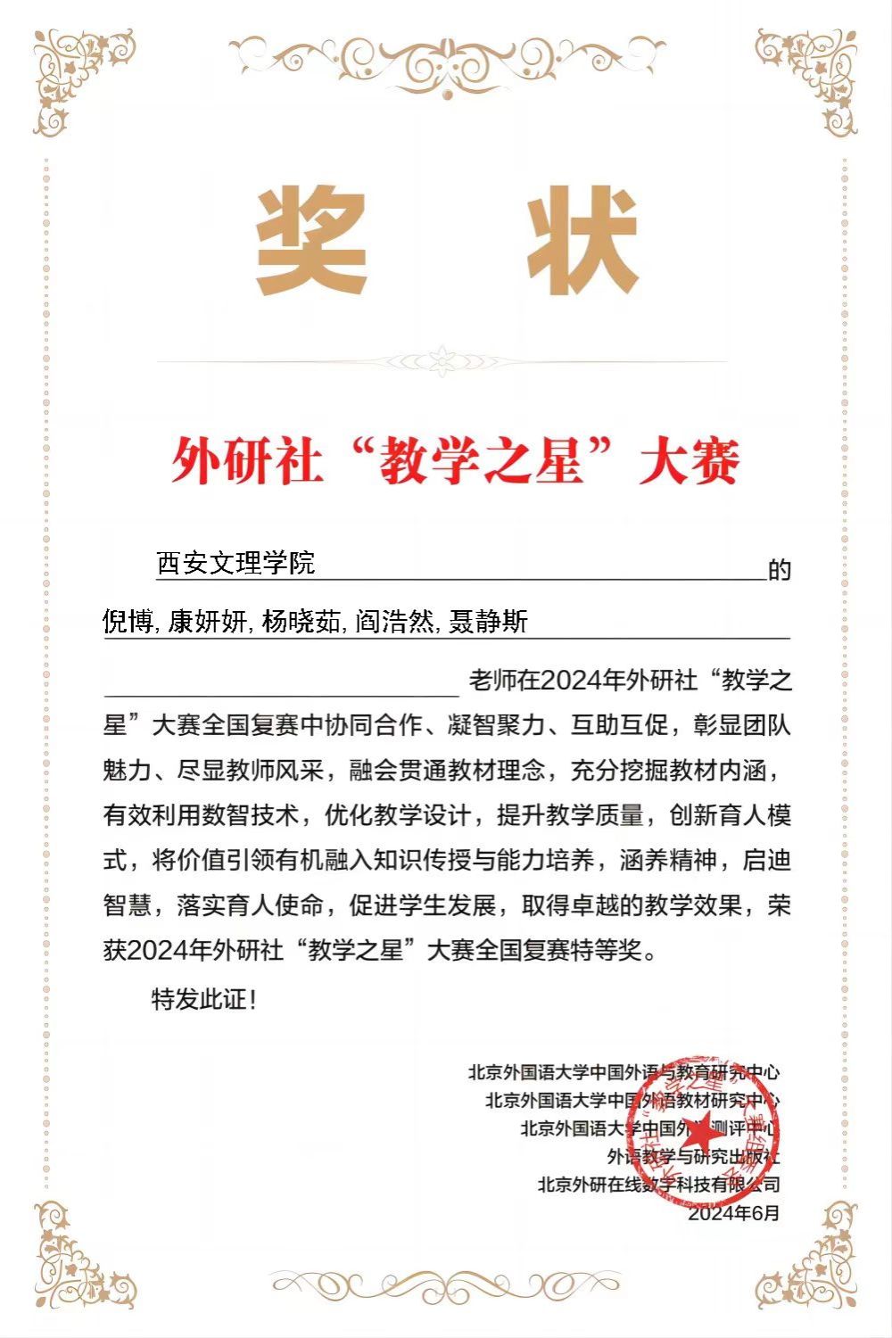 6月20 日,由北京外国语大学中国外语与教育研究中心、北京外国语大学中国外语教材研究中心、外语教学与研究出版社主办的2024外研社 “教学之星”大赛(本科英语组)全国半决赛晋级名单及全国复赛获奖名单公布。公司英国365集团官网英语类专业组教学团队(倪博、康妍妍、杨晓茹、阎浩然、聂静斯)在激烈的竞争中脱颖而出,荣获全国复赛特等奖,并作为陕西唯一的英语类专业组代表队晋级全国半决赛,实现了公司在该赛事上零的突破;同时,大学英语组教学团队(安璐、王洁、张东霞、张巨武、张晓华)表现突出,荣获全国复赛二等奖。