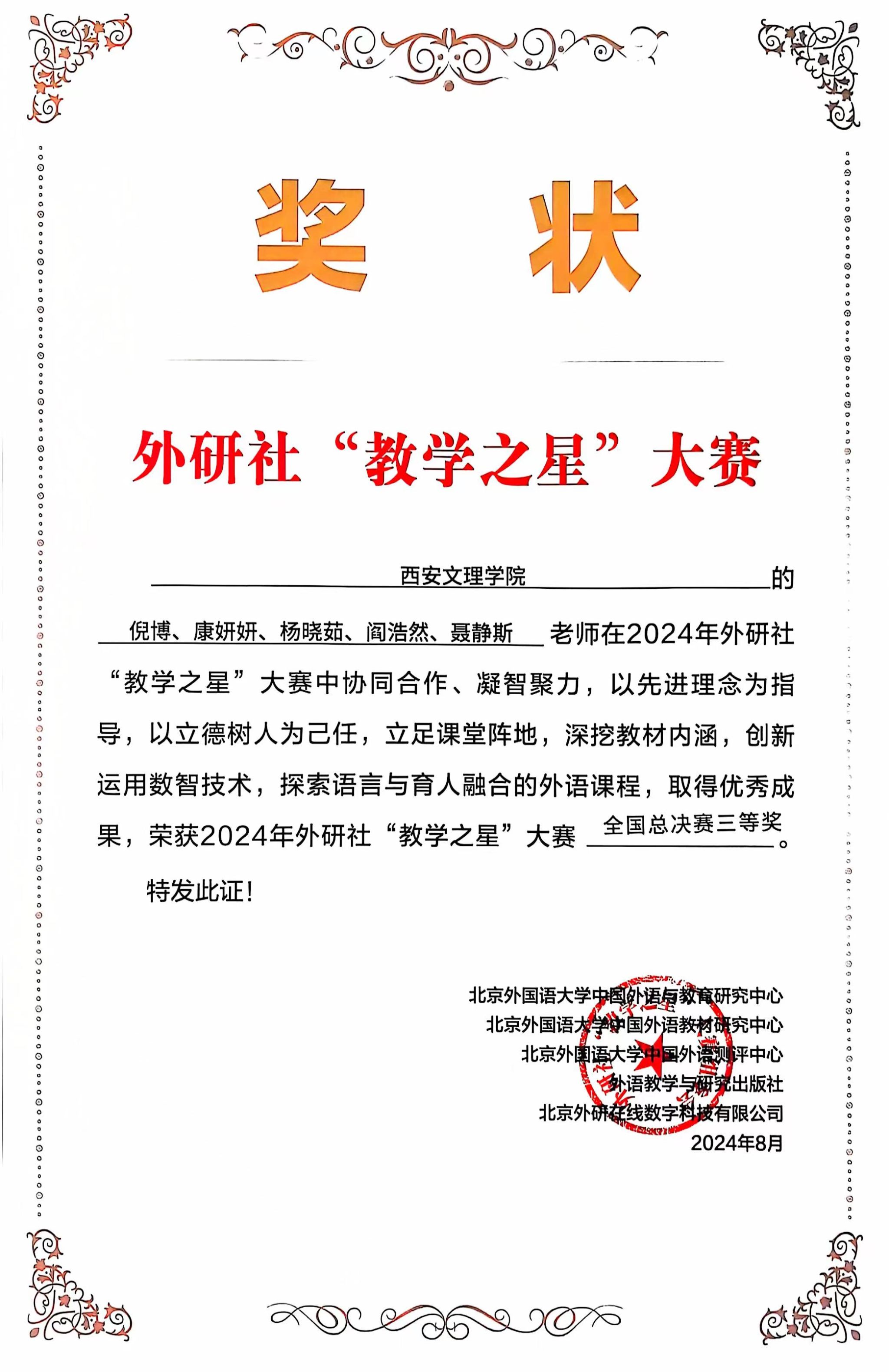 7月15日-8月5日,2024年外研社“教学之星”大赛全国半决赛于太原、合肥两地举办。公司英国365集团官网教师团队凭借新颖的教学理念,精湛的教学设计和精彩的教学展示,在全国复赛中荣获特等奖,并作为陕西省唯一的英语专业教学团队,成功晋级全国半决赛。在全国半决赛中,共有96组参赛教师团队,公司教师团队在众多参赛队伍中脱颖而出,最终荣获英语专业组全国总决赛三等奖。